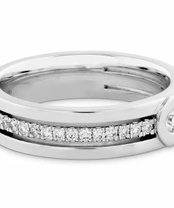 The Coupled Encompass Diamond Line Band provides a more high end look due to the row of Hearts On Fire diamonds surrounded by the outside a three layered band. In the middle sits a perfectly cut Hearts On Fire diamond. For the couple that exudes elegance and charm, this ring is the one for you.