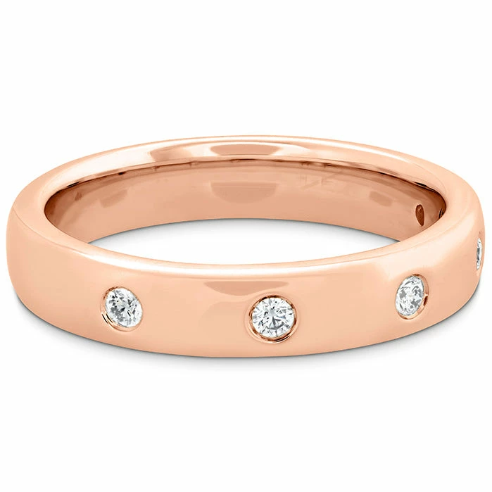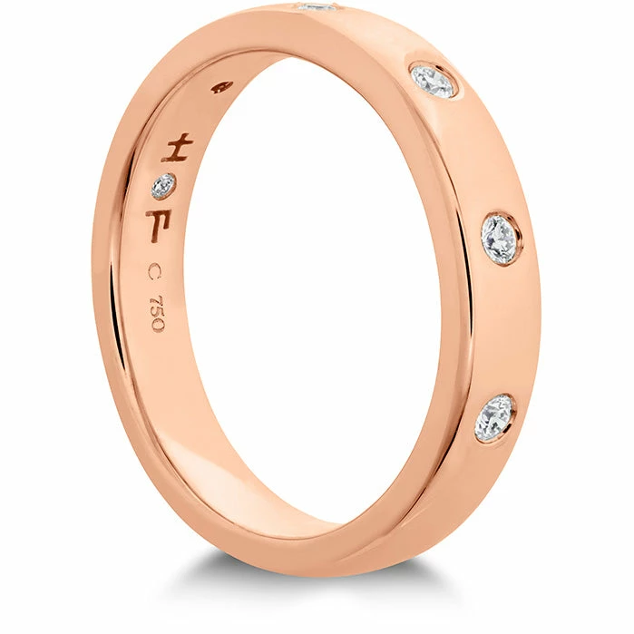An understated design for him, her, or both of you. This sleek, rounded 4 mm metal band is set with recessed diamonds and is specially designed for a comfortable fit. The metal is slightly burnished for beautiful shine.