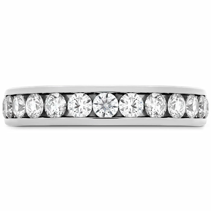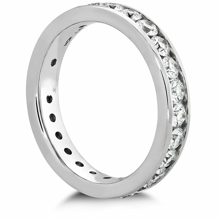 Perfectly cut diamonds around the entire band sparkle in a channel setting, flanked by two minimalist metal walls. The simple setting lets the diamonds take center stage.