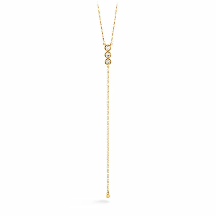 Three diamonds in a vertical line are surrounded by delicate Milgrain detail and set in an elegant Lariat necklace, weighted at the end of the chain with a solid gold ball.