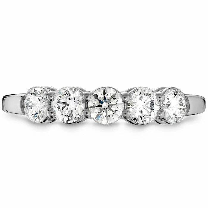 Five stunning round diamonds sit side-by-side on a solid metal band. Subtle heart impressions sit behind each gem, leaving an imprint on your finger whenever you remove your ring.