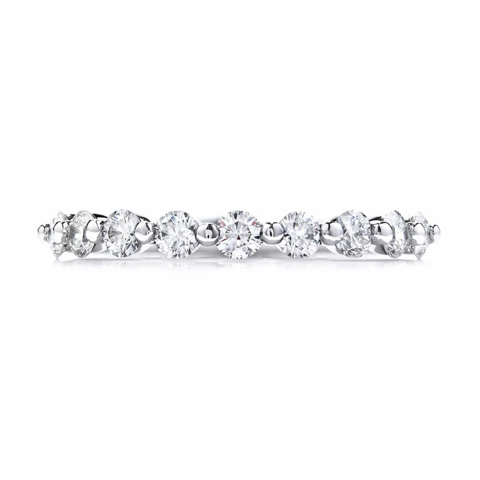 A diamond wedding ring to last throughout the ages, this ring features a brilliant procession of Hearts On Fire diamonds extended 3/4 of the way around an elegant band and single prong separations.